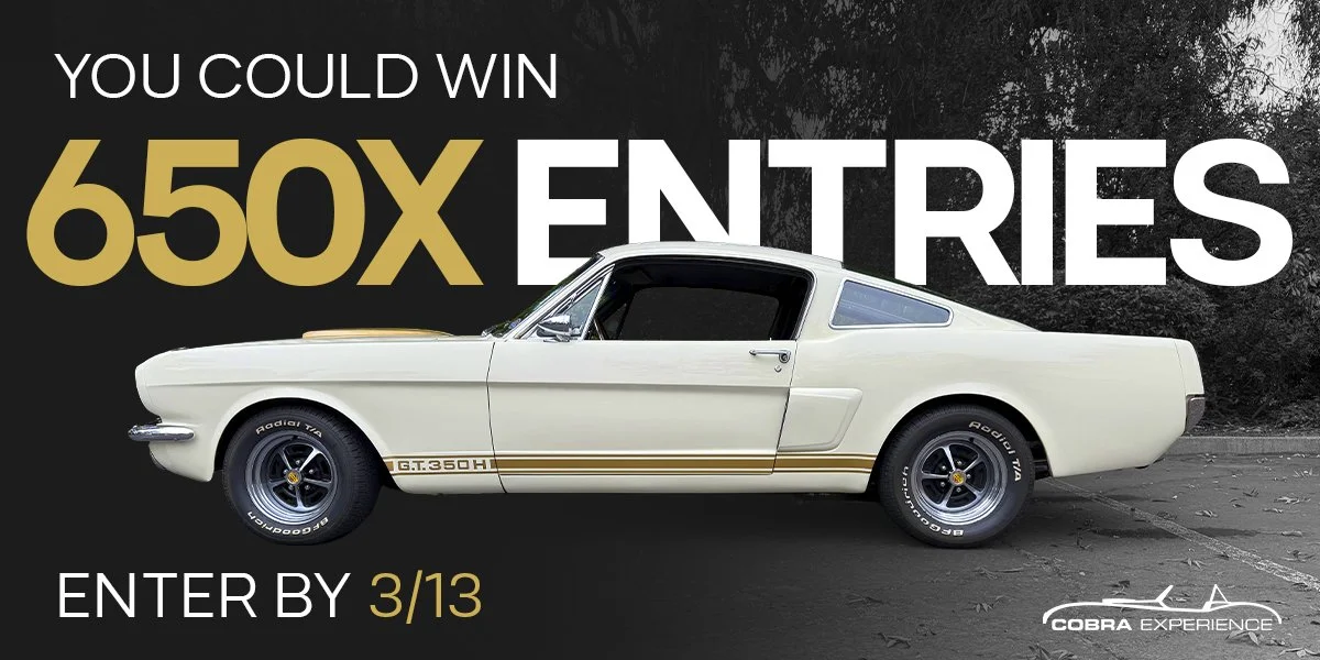 This sweepstakes features an extraordinarily rare 1966 Shelby GT350H, one of only 71 produced in this color combination, preserved and displayed as part of The Cobra Experience museum collection. Vehicles of this caliber are seldom offered outside of private or institutional collections, making this a truly special opportunity for one supporter.